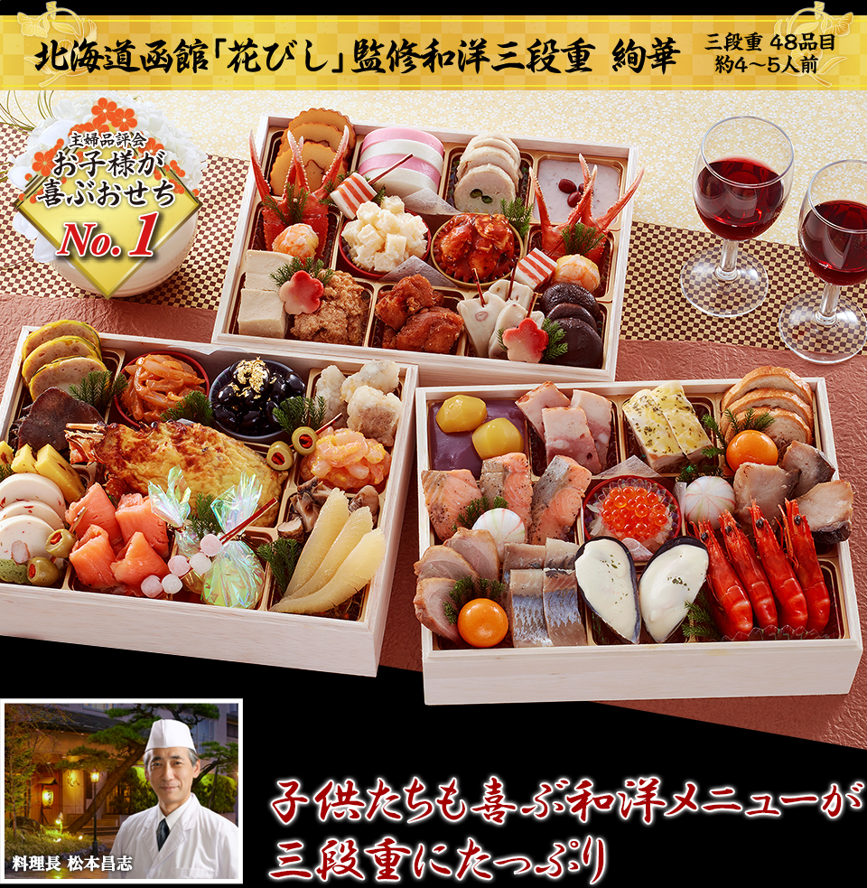 北海道函館「花びし」おせち料理・絢華は、子供たちにも食べやすい和洋メニューが盛りだくさんな三段重おせちです。「子供たちが喜ぶNO1」に輝いています。
