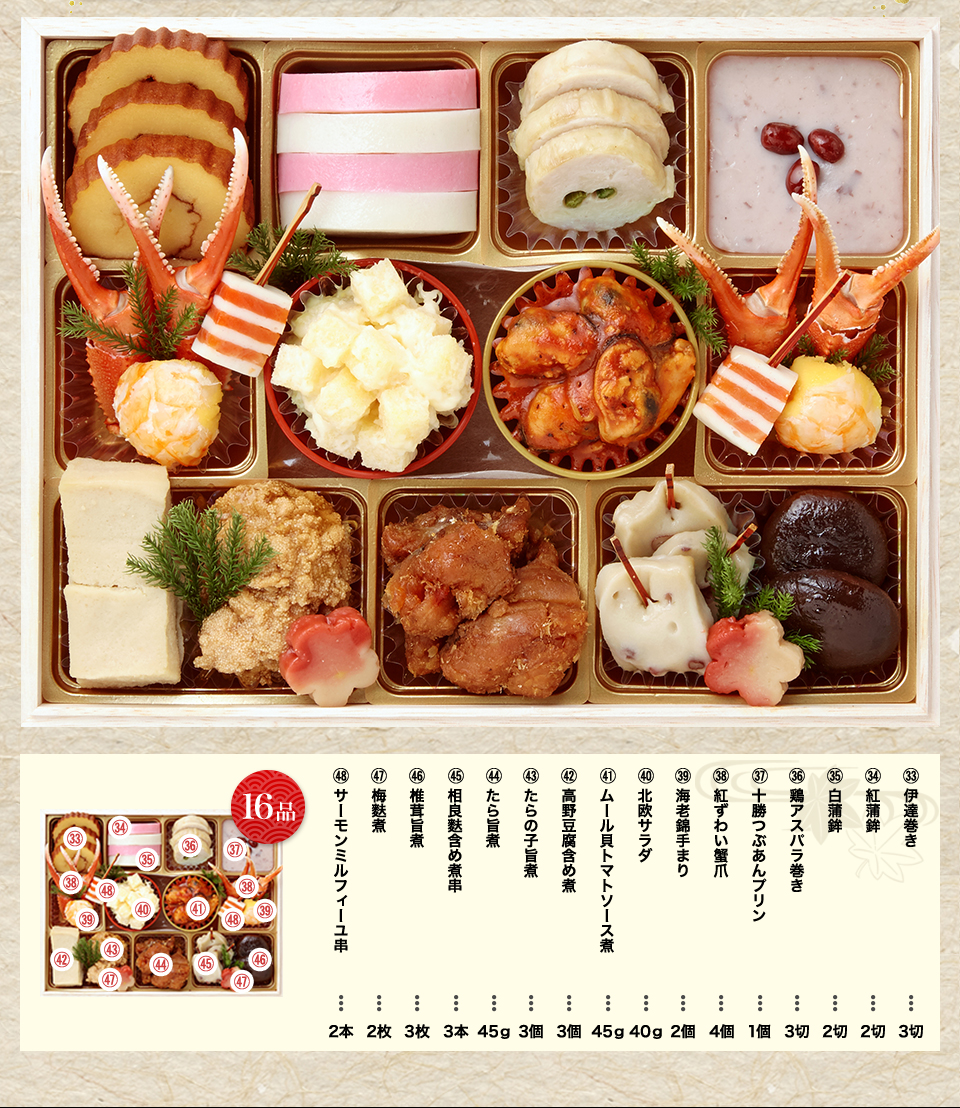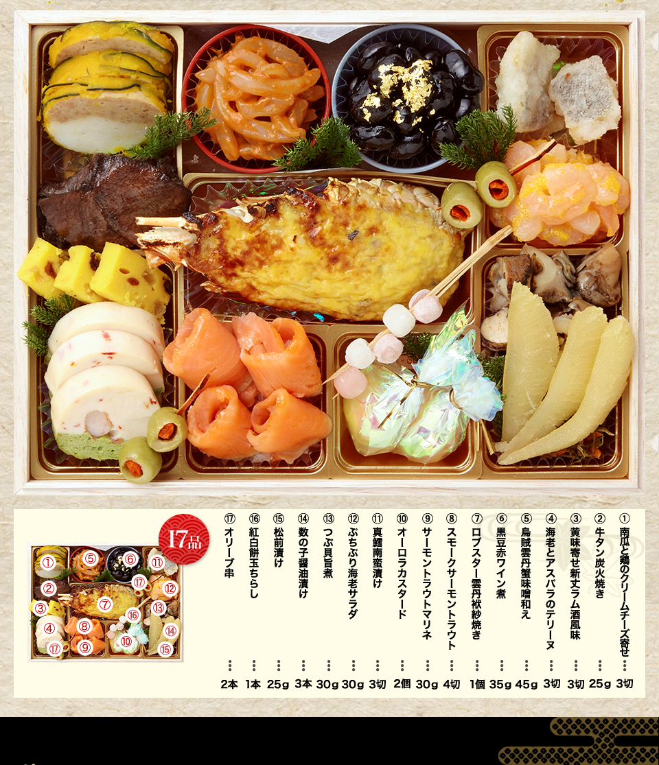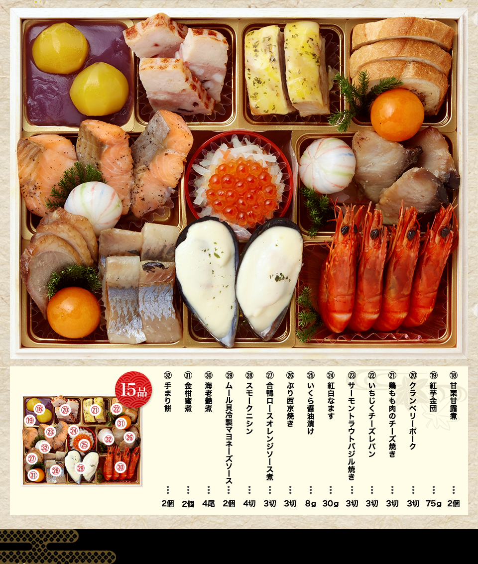 松前漬け、チーズ伊達巻、胡麻くるみ、黒豆赤ワイン煮、紅白なます、小川巻、サーモン錦糸巻き、直火焼き帆立、ロブスター、黄金鶏松風、真いか雲丹明太和え、紅鮭西京焼き、鰆西京焼き、海老錦てまり、たら旨煮、数の子醤油漬け、梅花人参含め煮