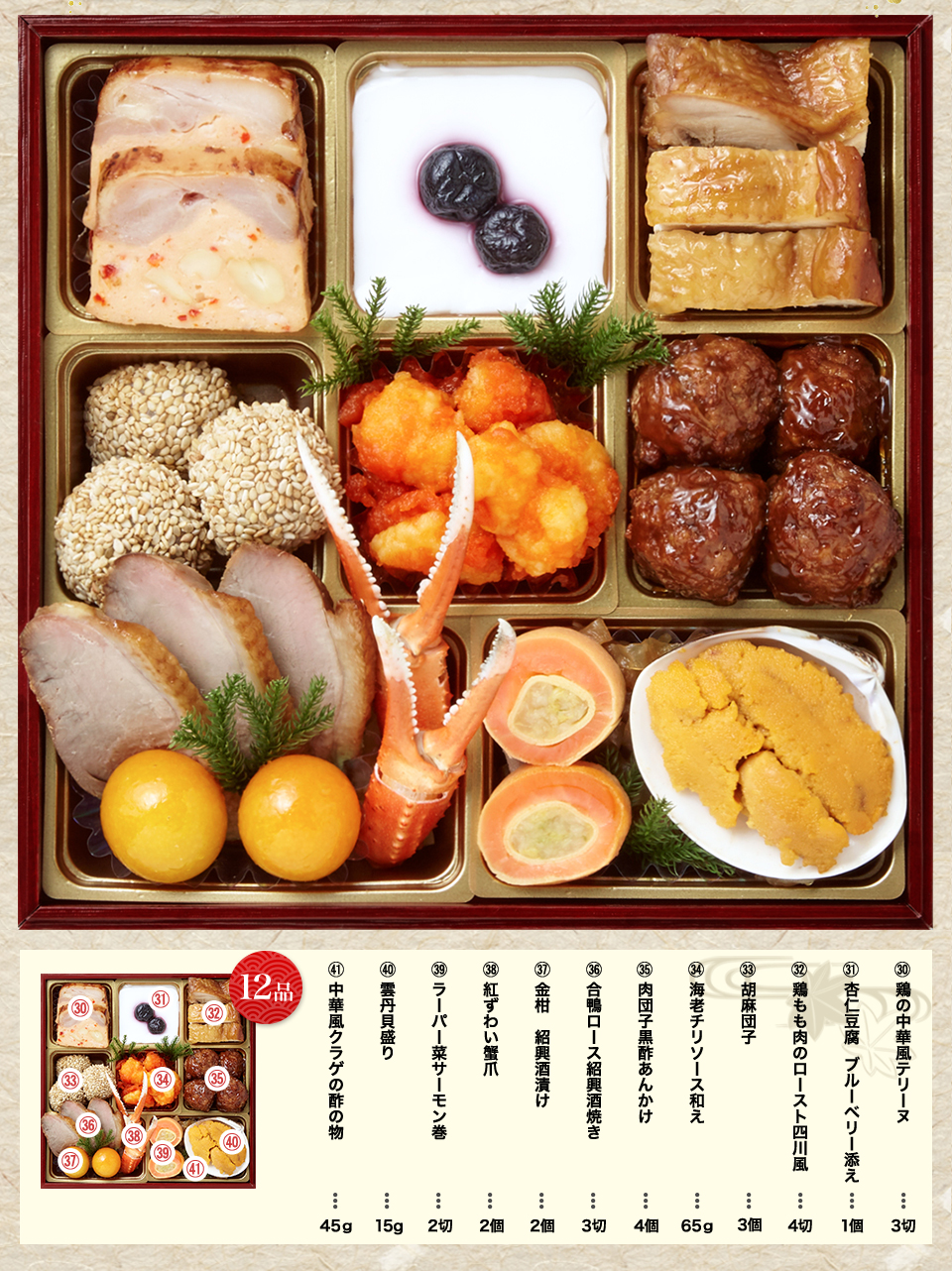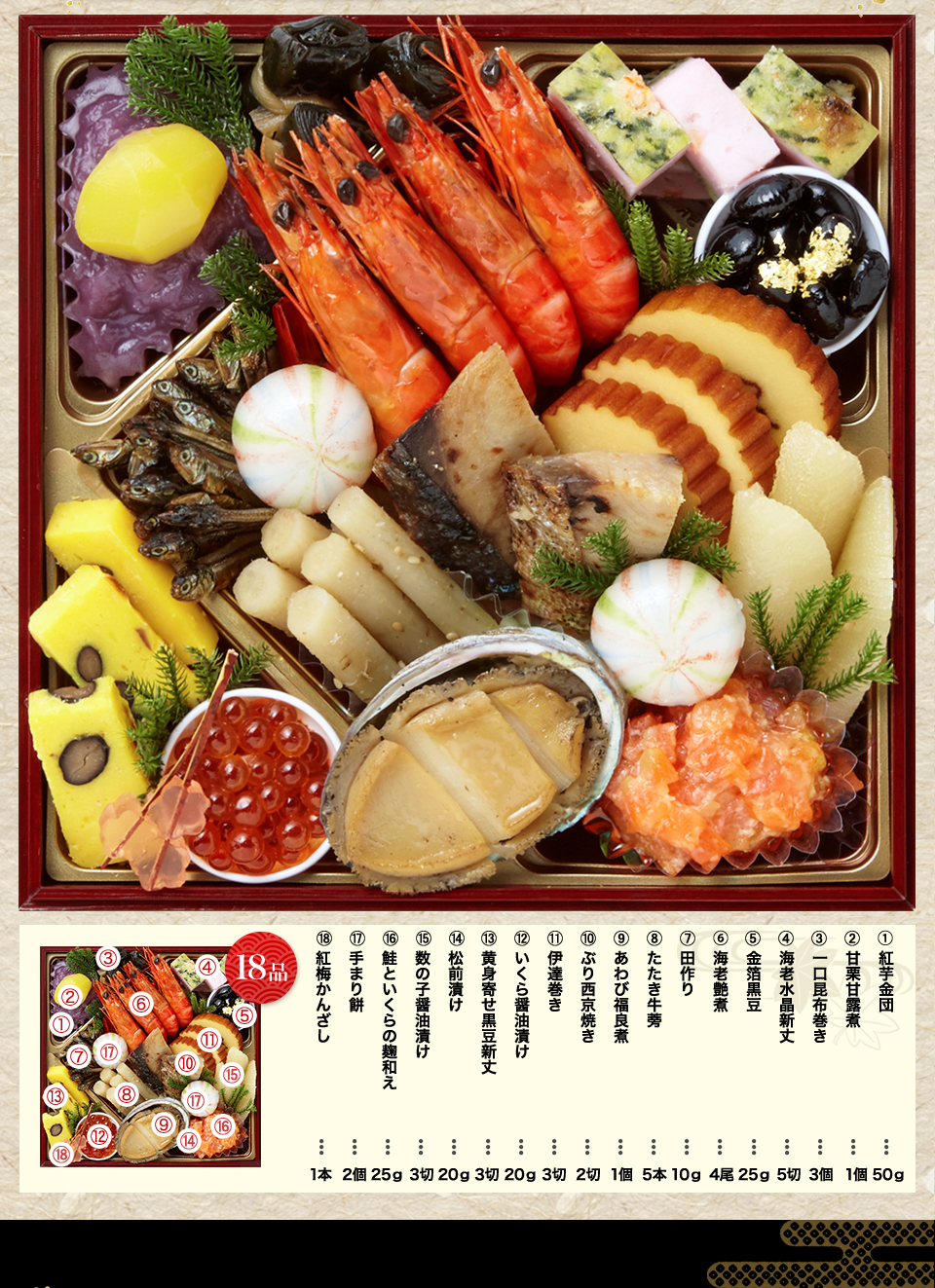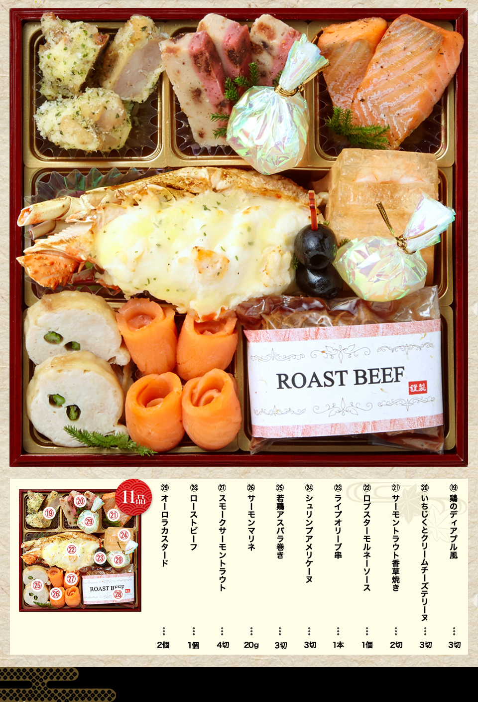松前漬け、チーズ伊達巻、胡麻くるみ、黒豆赤ワイン煮、紅白なます、小川巻、サーモン錦糸巻き、直火焼き帆立、ロブスター、黄金鶏松風、真いか雲丹明太和え、紅鮭西京焼き、鰆西京焼き、海老錦てまり、たら旨煮、数の子醤油漬け、梅花人参含め煮