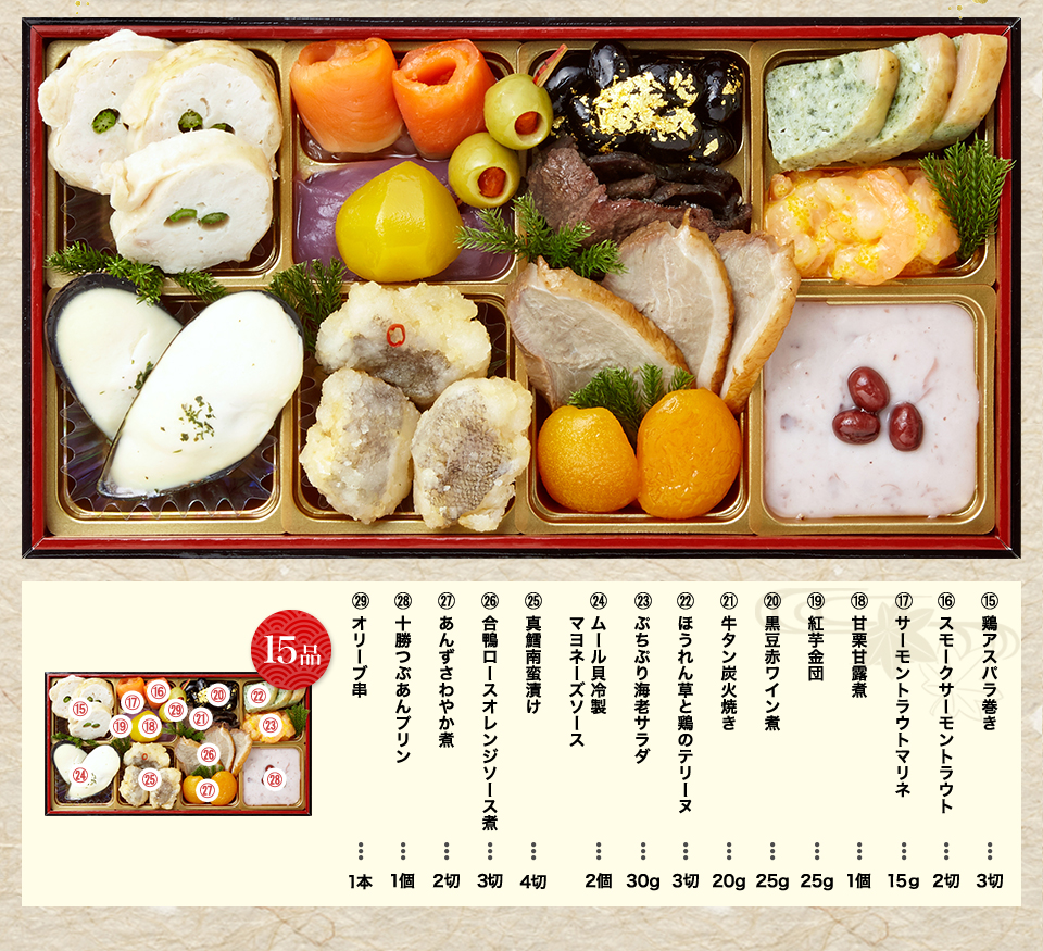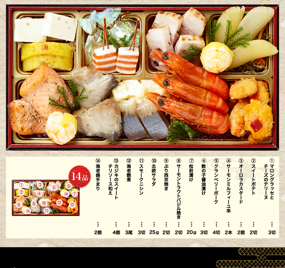 チーズ伊達巻、海老錦手まり、ほうれん草と若鶏のテリーヌ、オーロラカスタード、生ハムチーズ松葉、松前漬け、数の子白醤油漬け、紅鮭西京焼き、鰆西京焼き、金柑蜜煮、一口昆布巻、胡麻くるみ、京梅松葉串、海老艶煮、椎茸含め煮、梅麩