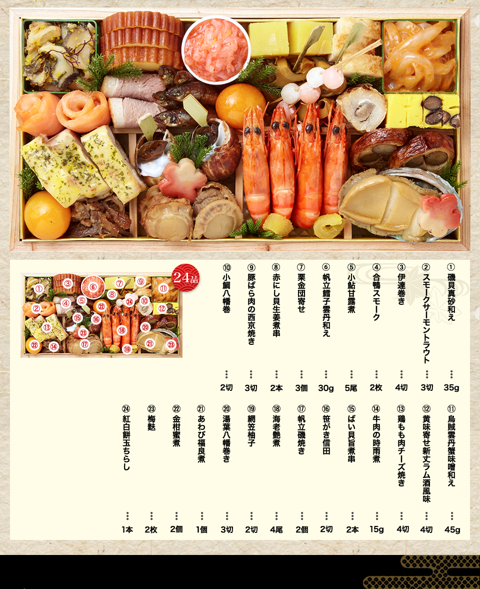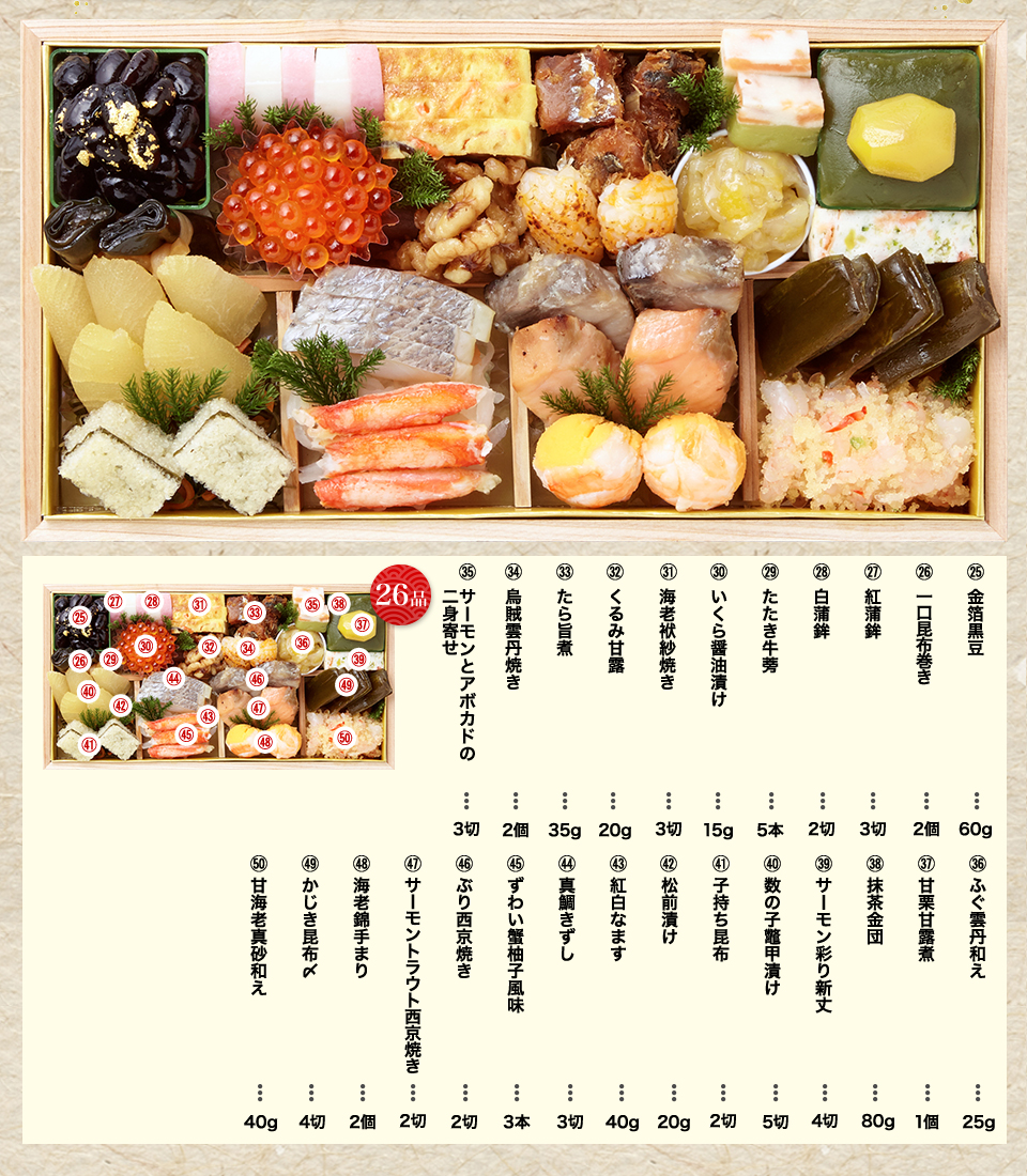 松前漬け、チーズ伊達巻、胡麻くるみ、黒豆赤ワイン煮、紅白なます、小川巻、サーモン錦糸巻き、直火焼き帆立、ロブスター、黄金鶏松風、真いか雲丹明太和え、紅鮭西京焼き、鰆西京焼き、海老錦てまり、たら旨煮、数の子醤油漬け、梅花人参含め煮