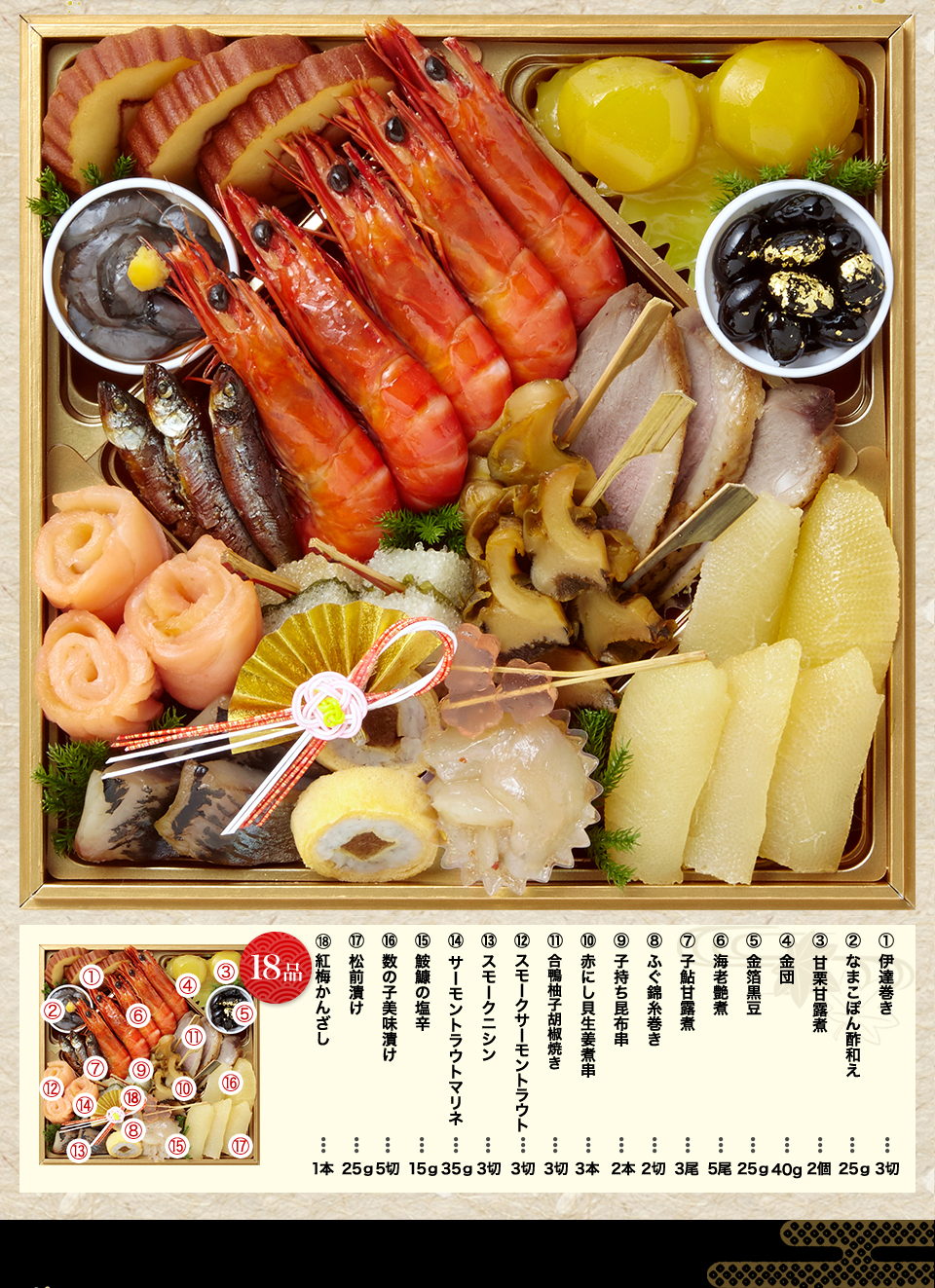 金箔黒豆、帆立鱈子和え、金団、渋皮栗甘露煮、紅鮭スモークサーモン、田作り、こはだかぶら漬け、金箔抹茶羊羹、胡麻くるみ、かき時雨煮、あんずさわやか煮、海老艶煮、百合根甘露煮