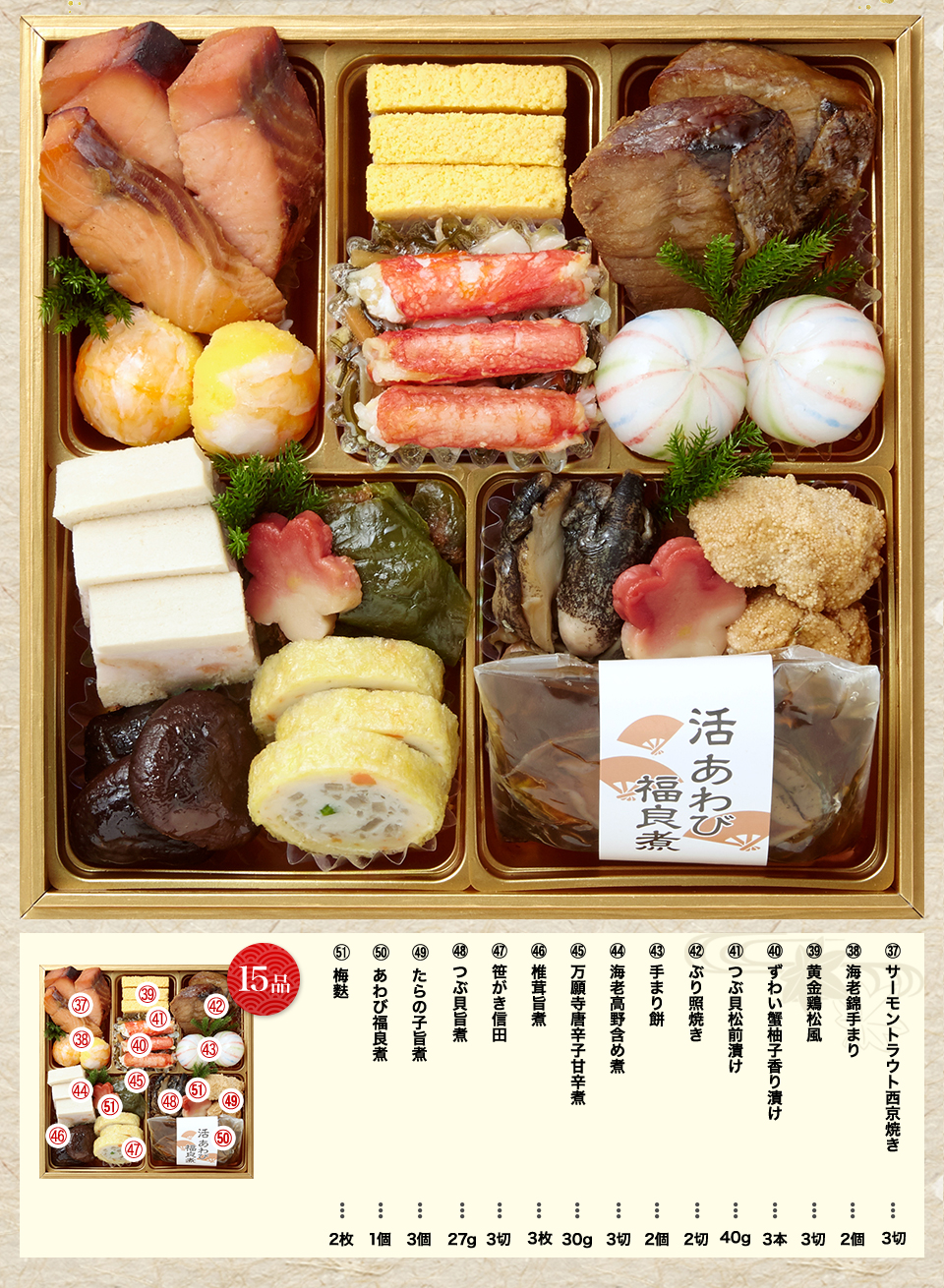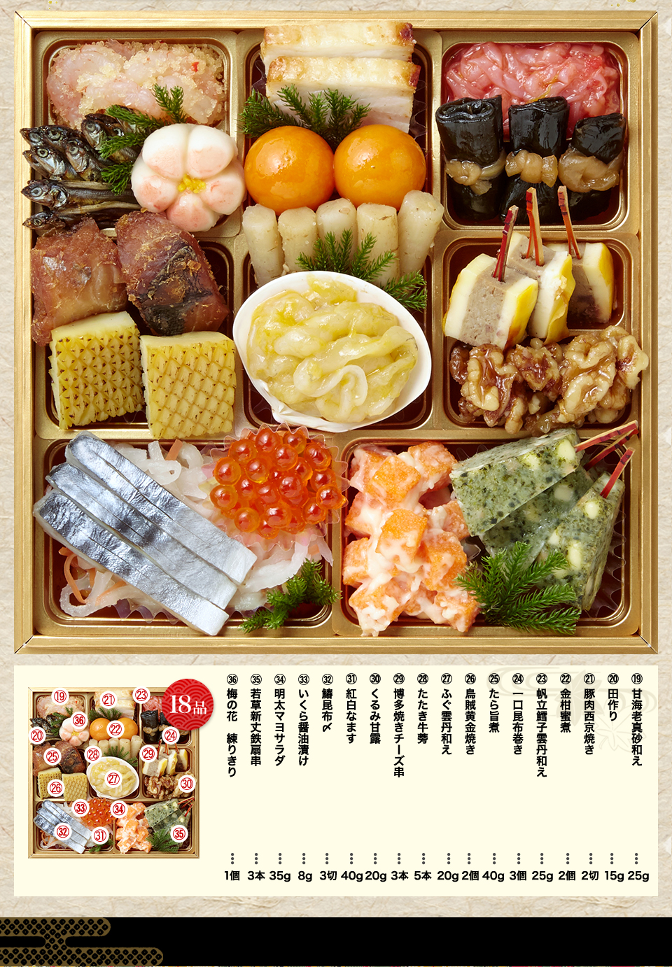 磯貝雲丹和え、たたき牛蒡、黄身寄せ新丈ラム風味、真鱈子旨煮、黄味寄席新丈ラム風味、お多福豆、京梅松葉串、紅鮭西京焼き、金柑蜜煮、ぶり照焼、紅白なます、ずわい蟹柚子香り漬け、鶏松風、烏賊雲丹かんざし、一口焼き湯葉巻き、ひねりこんにゃく、梅麩、笹がき信田、椎茸含め煮