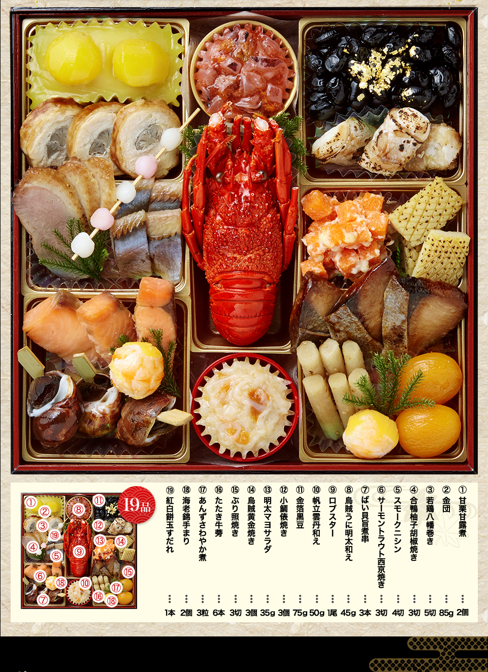 帆立黄金和え、磯貝真砂和え、烏賊うに明太和え、こはだ粟漬け、金箔黒豆、黄金鶏松風、若鶏柚子胡椒焼き、ロブスター、金団、渋皮栗甘露煮、松前漬け、梅の花 練りきり、たたき牛蒡、田作り、百合根甘露煮、さつまいもしっとり煮、数の子美味漬け、金甘蜜煮、京梅松葉串