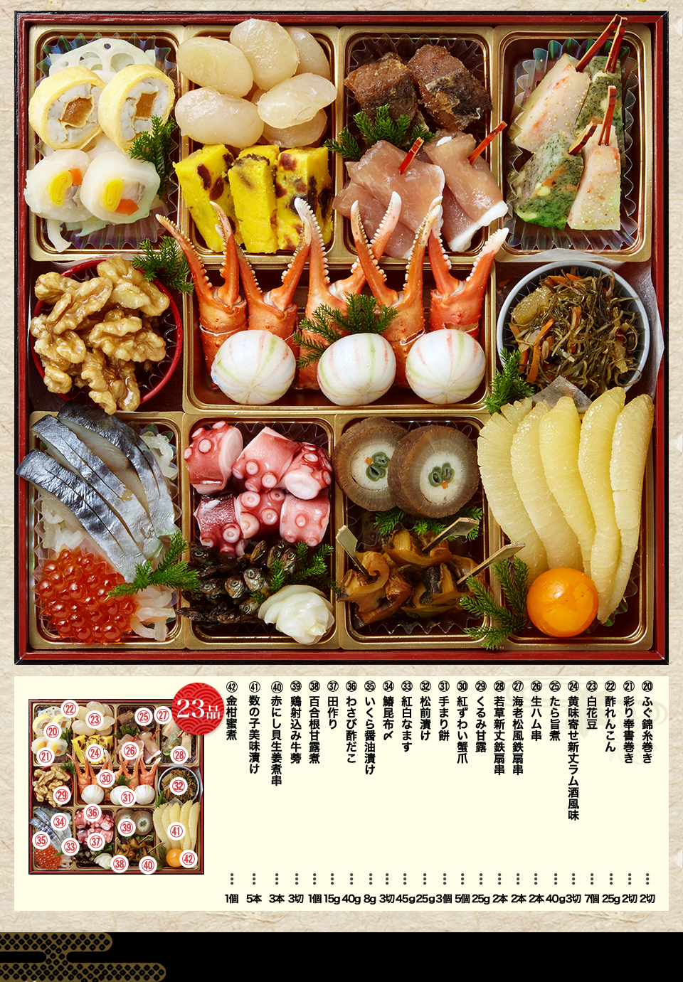 伊達巻き、ベイクドチーズパウンド、若桃甘露煮、酢れんこん、錦糸巻き、龍皮巻き、チキンテリーヌ、鰆昆布〆、紅白なます、海老艶煮、紅白餅玉ちらし、宇治抹茶プリン、甘栗甘露煮、雲丹新丈、ばい貝旨煮串、ぶり照焼、海老錦手まり、紅鮭西京焼き、手まり餅、笹がき信田、子持ち烏賊